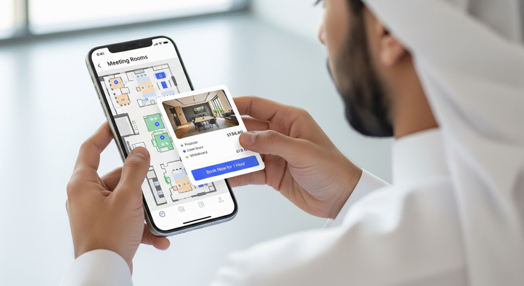 • لمساحات العمل: صور احترافية لغرفة الاجتماعات، المكاتب الخاصة، ومنطقة العمل المشتركة. قائمة بالميزات: سعة الغرفة، وجود بروجكتر، سبورة ذكية، سرعة الإنترنت، توفر القهوة والماء.